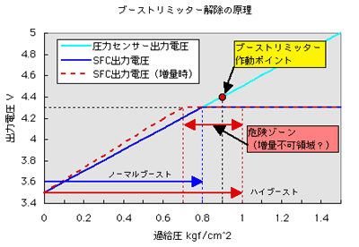 左図はFIELD技研のSFC HYPERによるブーストリミッター解除の原理だ。ノーマルでは過給圧0.9kgf/cm^2でブーストリミッターが作動し、燃料をカットする。そこでSFC側の吸気管圧力センサーの出力信号を4.3Vから一定電圧として出力する。こうすることでブーストリミッターは解除することが可能。ただし、4.3Vに達したところで吸入空気量は一定という情報をコンピューターへ与えていることになるため、燃料はそれ以上増えない。サブコンでは大幅なブーストアップは危険である。別に追加インジェクターなどで対応する必要がある。