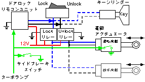 「ドアロッくん3」はほとんどの車種に取り付けられるようにできており、ドアロックリレーを使用しない車種のためにスイッチ用の端子が用意されています。そこでひらめいたのが自動ロックシステム。まあ、高級車にはあたりまえのようについていますが、スプリンターから持ってきたロックシステムはただスイッチに連動するだけ。走り出したらロックされるようにするには、ターボランプ(加給圧0.4kg/cm2に達するとオン)にロックを連動させればよいのだ。しかし、そのまま配線するとターボランプがついたり消えたりすることで、その都度電磁アクチュエータに電圧がかかってしまい負担が大きくなってしまいます。そこはやっぱりアクチュエータ側にちゃんとリミットスイッチが内蔵されてあったのでこれを利用しました。ロックされるとボディーにアースされるようにすると、一度ロックされれば、次からのターボランプには連動しなくなるのです。実際に配線したところ、問題発覚。ターボランプはイグニッションをオンにするとはじめに光るんですよね。つまり始動直後にロックされてしまうのでした。そこで対策2としてサイドブレーキスイッチの利用。エンジン始動時はサイドブレーキを引いているためこのスイッチを並列につなぐことで、サイドブレーキを引いているときはターボランプには連動しなくなります。こうして自動ロックシステムは正常動作するようになりました。【98.4.25】