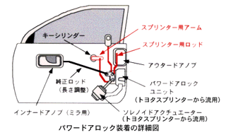 これは、パワーウィンドウの装着と同時進行でやろうと考えていた。ドアロックのユニットを探すに当たって、パワーウィンドウのスイッチパネルにドアロックのスイッチも取り付けられるようなものを考えていた。また、ダイハツはトヨタグループであるからトヨタ車の部品を使えば比較的簡単に付けられるのではないかという考えもあった。そこで、解体屋で見つけたスプリンターからソレノイドアクチュエータ式のドアロックユニットとドアノブとリンクしていた金属ロッドを一式買った。なじみの解体屋だったので値切ったらひとまとめで1000円で売ってくれた。
