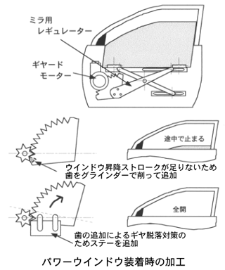 流用するのはやはりミラのレギュレーターで、これもミラのシートと一緒に買ったのだが、リーザにも純正でパワーウィンドウの設定があるので、レギュレータはミラと同じだと思った。実際に付けてみると、ネジ穴の位置は全く同じだった。そして、電源をつないで試動させてみると、ガーン!なんと窓が最後まで降りてくれなかったのである。ミラとリーザでは窓の開閉距離が違うようだった。またまた壁にぶつかった私は考えた。あと2cm程度降りてくれればいいのだが。よし!窓が途中で止まってしまうなら、動作範囲をのばすために、歯車を追加してやればいいじゃないか。そこで、グラインダーを使ってレギュレータの歯車を一つ作ってしまった。