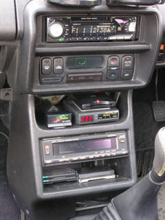 追加メータには上記の5種類をまとめて配置してある。上記のデジタルスピードメータにはライトコントローラー機能を持っていて、オプションで8、000円もかけないと使えないのだ。しかし、なんのことはない、自分でリレーをつないでやれば機能するのだ。このライトコントローラは車速が0になった5秒後にヘッドライトが切れるようになっている。さらに親切なことに、右折待ちなどで、ウインカーを出しているときはライトが点灯したままになるのである。この機能を生かすためには、ウインカーの配線にダイオードをつながなければならない。こうすることで、完全に機能させることができた。ちなみに、ターボタイマーのコネクタも自作である。