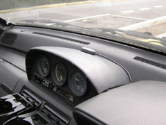 メーターパネルはベニア板を重ねて作ってあり、表面にはオーディオパネル用の化粧板を使って質感を出している。そして、メーターフードはFRPで作った。フード形状はメインメータのフードと同じ形にして、デザインの統一をめざした。成形に当たっては、発泡スチロールを雄型に使い、ガムテープで覆うことで溶けないようにした。曲面を出すのはペーパー掛けとパテうめを繰り返す根気のいる仕事である。表面を仕上げた後パワーウィンドウ制作で使用した内装の生地を貼った。
