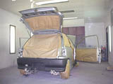 今回は3コートパールなので、塗装に時間がかるため前日にマスキングなどの準備を終わらせることにしました。まずはジュントールの塗装ブースにクルマをいれて、不要な部品を外します。写真のとおり、ドアのウェザーストリップ、モールなどすべて外しました。またマスキングはドアステップやテールゲート内側なども一部塗装するため写真のようなマスキングをしました。前回の経験から室内のシートやインパネにもビニールや布をかぶせることにしました。塗装ブースは大きな換気扇を回しながら塗装するため、クルマの室内にも塗料の粉が入り込みます。シートやインパネを汚さないためにはこれが必要です。
