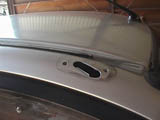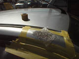 リーザTR-ZZにはセンターアンテナが標準装備。ところが前モデルがAピラーアンテナだったのでその穴が蓋されているんです。というわけでついでにスムージングすることにしました。取り付け穴周辺を一度ハンマーでたたいて凹ませてFRPを貼ってパテ盛り。けっこう簡単です。それからリヤスポイラーの取り付け穴も同様にふさぎました。