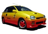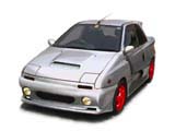 左の写真では、ボンネットエアスクープを広げてセンターに移動しました。そして、リップスポイラーを左右結合し、くぼみをなくしました。また、もともとのブリスターフェンダーを大きくし、フェンダーの張り出しを強調しました。このフロントフェンダーの膨らみをリヤにもコピーしてリヤのブリスターフェンダーも合成しました。ホイールは赤色に着色。