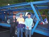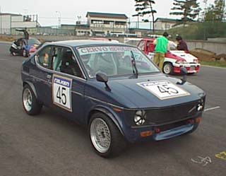 こいつが我がチームCARROTのマシン「セルボ・ヘボリューション!」だあ!!ブルーメタリックにオールペンされた極上のクルマを間瀬スペシャルに改造してしまったのです。メインで手がけているのはCARROTのメンバー、富山、高嶋、高辺。今回は初のドライバーとして私も加わりました。
