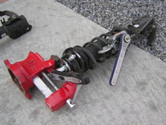 前にも使ったチェーンホイストによるスプリングコンプレッサーの代替え作業。アッパーマウントを外すのに一苦労しました。本来専用工具があれば、ナットをゆるめることができますが、もってないので万力でアッパーマウント部をはさみゆるめました。(あまりお勧めできません。)これにより無事スプリング交換完了。フロントはなぜか等長ピッチでした。リヤは不等長ピッチです。