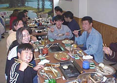 11:00になるとほとんどみんな集合し、あいにくの天気だったので2階のお座敷でバーベキューということになりました。ここ森の里には小さな釣り堀があってニジマスの釣り堀大会がはじまりました。なんとそこでつり上げたマスをその場で塩焼きにして持ってきてくれるということでした。MONA+CARROTは代表の増田ファミリーが人数分(9匹)も釣ってくれました。おかげで焼き肉、焼きそばでお腹いっぱいになったところにさらにマスの塩焼きと豪勢なお昼ご飯となりました。でも予想以上においしかったです。