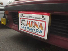 MONAメンバーが定期的に参戦しているダイチャレですが、今回はメンバーがたくさん集まりそうなのでわたしも急遽応援にかけつけました。せっかく集まるならばということでMONAオリジナルナンバープレートを準備。(発案は長谷川さん)ダイチャレのキャッチコピーを一部もらってMONAステッカーデザインに「We Love DAIHATSU Challenge Cup!」という文字を追加。右の写真は横山さんのターボZにつけたもの。PDFファイルはこちら。