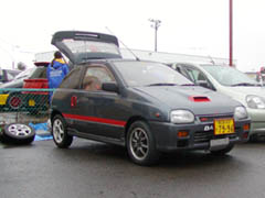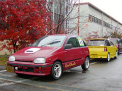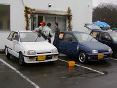 わたしは8:00ちょっと過ぎに会場に到着しました。すでにみなさん準備中。まずは長谷川リーザ。今回ダブルエントリーの中村さんが来れないということで、急遽わたしが代理出走となりました。そして隣の紺色のchachaは長谷川さんの友人で、鈴木さん。4MTのシフトノブがついているんですが、5MTに換装済みです。さすがHTS仕込み。