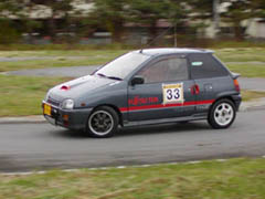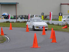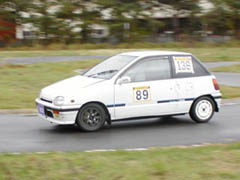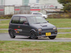 午後からの第3ヒートはようやく路面が乾きはじめた状態です。ほとんどのドライバーがタイムアップしてきました。写真はゼッケン22番のしったかたーさんのミラ(スラローム後の折り返し地点)とゼッケン120番の鈴木さんのchacha(最終コーナー)。