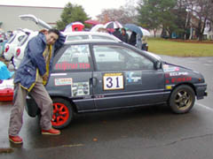 第4ヒート途中から登場したフッちゃんですが、写真のとおり片腕状態。誰かに運転してきてもらったのかと思ったら、片腕で運転してきたとのこと。さらにシビックはMTらしい。みなさんくれぐれも真似しないように。