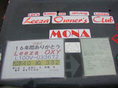 そしてこちらは田中さん。なにやらいつもよりいろいろ貼ってあります。ボンネットを見ると「引退式 16年間ありがとう。 思い出と出会いと仲間を君が与えてくれた」とありました。となりには車検証のカラーコピーが2枚。昭和62年の初年度登録から16年。新車購入からのおつきあいということで思い入れも大きいでしょう。どうやら今年いっぱいでOXYの引退を決意したそうです。思えばわたしも田中さんとはクラブ会報Vol.3(1995/4)以来、8年のつきあいですね。