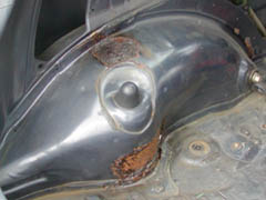 参考に昨年撮ったリヤホイールハウスのさびを紹介します。フレームとのつなぎ目に白い点が見えるんですが、これは外の光です。現在はもっと大きくなっているかも。