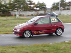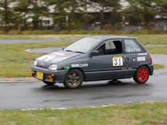 第2ヒートでは雨はあがったものの、まだまだつるつる状態。写真はゼッケン44よっちさん。助手席には彼女さんが毎回同乗。撮影場所はヘアピン前のコーナーです。