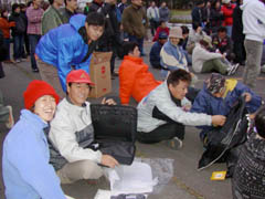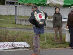 表彰式のあとに恒例の抽選会が実施されました。毎回珍品が登場する抽選会ですが、今回も笑えるものが・・・。「皮ジャン」です。真っ黒で背中に赤い日の丸が・・・。「ぜったい欲しくなーい。」という声があちこちから聞こえてきます。それを射止めたのは田中さんでした。さすが田中さん。もらってすぐに着てポーズ。大爆笑のパフォーマンスでした。