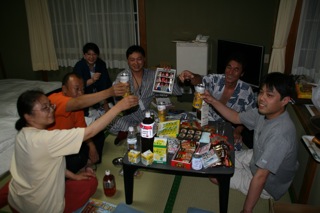 夕食を終えてしばらくしてからクラブミーティングという名の飲み会がスタート。恒例のご当地お土産を持ち寄っての宴会。相変わらず食べきれない量が集まりました。いつもみなさんありがとうございます。