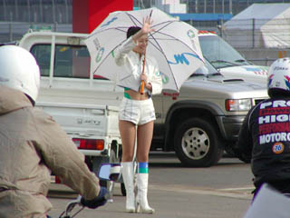 実はパレードランのコースイン、チェッカーフラッグ、そしてコースアウトに笑顔で手を振ってくれたもてぎエンジェルがいたんですね。光学10倍ズームで2輪走行中に撮影させていただきました。