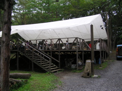 BBQの会場は右の写真です。大きなウッドデッキでわいわいと楽しめる場所です。テント状の屋根があるので、多少の雨も問題なし。
