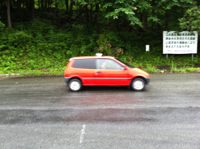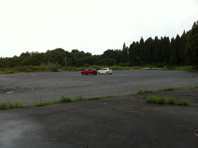 最初の写真が臨時駐車場の入り口。他にもサーキットコースもあるんですが、今回はここを予約しました。次の写真がクルマの運動会会場。レイアウト図の右上から撮影したもの。敷地は上と下に別れていて、下側をメインの駐車場として使う予定。