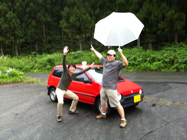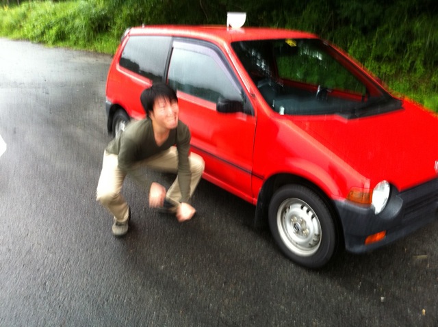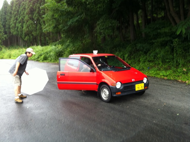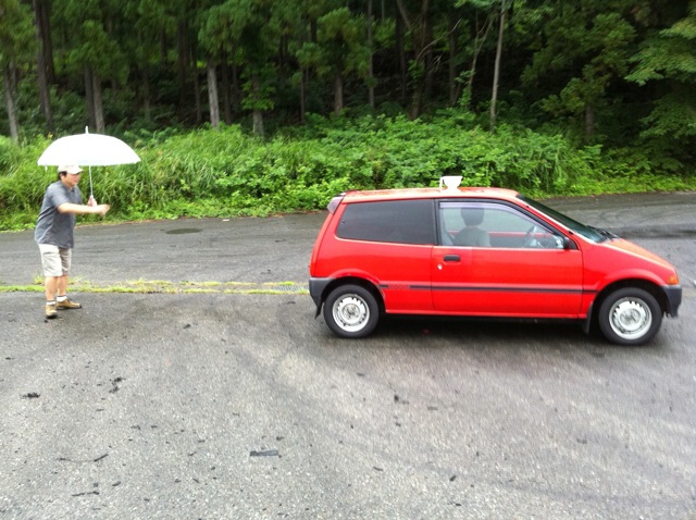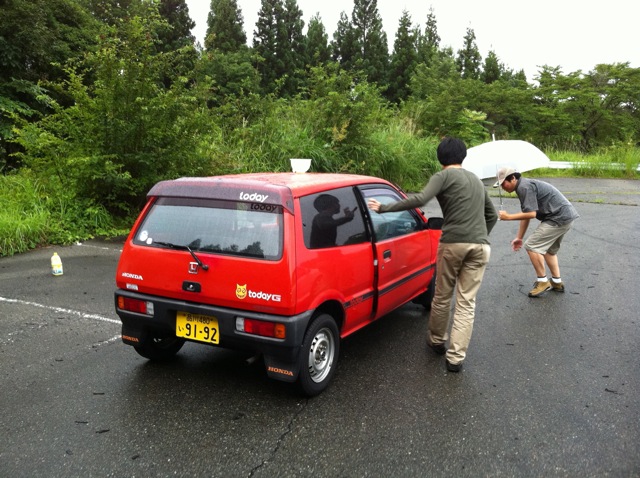 1. チームで一台選出。ルーフに水がタップリ入ったカップをマグネットで装着してスタート位置にクルマを停止。チームメンバーは指定のスタートエリアに集合してスタンバイして、用意スタート!!