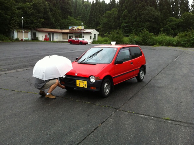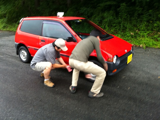 5. その後、ピットエリアに向かう。ピットエリアではタイヤを一つはずして、修理センターへ預ける。ドライバーは必ず降りること。写真はパンタジャッキを使ってタイヤを外しているシーン。