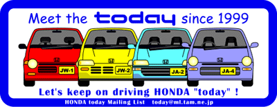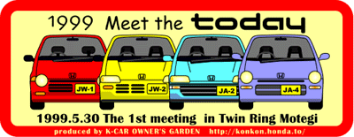 TRMにて企画会議を行いました。営業の方と現地での打ち合わせをして、以下の予定で行きたいと思います。営業の方の提案でパレードランを行うことになりました。お楽しみに。【1999.4.19】 ■当日のタイムテーブル AM 9:00 道の駅もてぎに集合(南駐車場) (受付時に会費徴収&ステッカー配布) AM 9:30 道の駅出発 めざせ!トゥデイ30台ツーリング。(約10分) AM 9:45 ツインリンクもてぎ入場 第7駐車場にトゥデイを並べる AM10:00 自己PR&トゥデイPRタイム ひとり3分として20人で60分 その後フリータイム(スワップミートなど) AM11:30 昼食 弁当 (雨天時:スイートルームで昼食) PM12:30 ホンダ・コレクションホール見学 PM13:00 コレクションホールレストアスタッフによるメンテ講座 (コレクションホール内オリエンテーション室) PM14:00 ミゼットカーレース大会 (5台ずつ出走し、各グループのトップのタイムで1,2,3位決定) PM15:00 記念撮影:会場にて集合写真 パレードラン:TRM外周路をみんなで走行。(制限速度30km/h) PM16:00 解散 | |