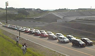 しかーし。5グループにわけて移動を計画していたんですがこれがなかなか誘導に時間がかかって四苦八苦。ごらんの通りひろい駐車場に5列編隊をつくってさあ出発。(手際の悪さは反省しています。みなさんごめんなさい)