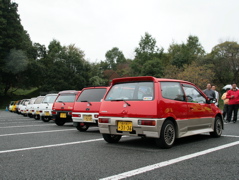 今回はスタッフの準備が多くなかったので、私も8:30に到着しました。すでにずらっとトゥデイが10台以上ならんでいました。天気予報では晴れと聞いていたんですが、いまいち曇り。ちょっと雨もパラパラと落ちてくる状況。一部の方は傘を開きはじめました。なんとか持ってくれればいいのですが。