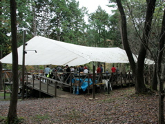 11:00より今回予約した大きなウッドデッキに移動。すでにドラム缶で作った3台の大型コンロに火がともっていました。適当に3グループにわかれて、BBQスタートとなりました。