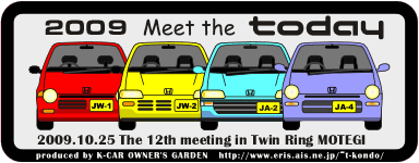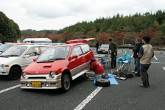 その後、なにやら人だかりと、傾いたトゥデイを発見。みやかわさんJW1がなにやら工事中です。その場で燃料ポンプを交換したそうです。昨年はKisaragiさんのトゥデイの大工事がありましたが・・・。毎回いろんな工事が発生します。楽しいイベントです。?