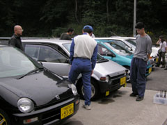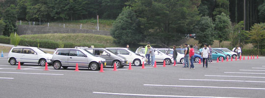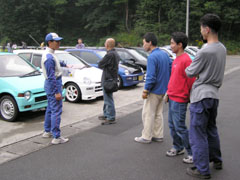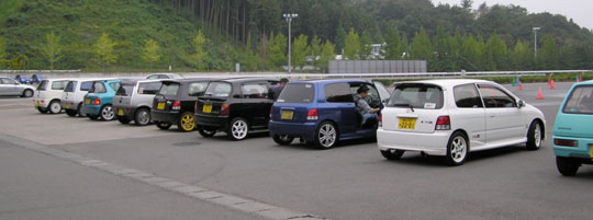初日の集合場所はツインリンクホテルの下に位置する第2駐車場。定刻には半分以上のトゥデイがすでに整列していました。engelさんのE07Z搭載のJA4には注目が集まっていました。エンジン位置が異なるのに相当苦労して載せたそうです。受付を行っている最中に今回お世話になったツインリンクもてぎの営業さんが挨拶に来てくれました。