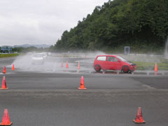 実際に走ってみるとまず、シャワーで前がよく見えない。まして路面がどこで変わるのかもよくわからない。何度も走ってみて滑りやすい部分を覚え込む必要があります。微妙なアクセルワークとブレーキコントロールが必須。ちょっとでも動作が大きいとツーっとアンダーステア。うまく曲がったと思いきや今度はリヤがスライド。タイムを出すには相当なスキルが必要と感じました。