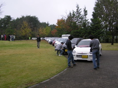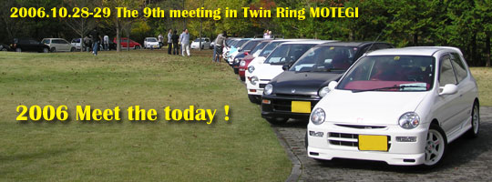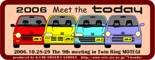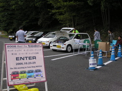 我々スタッフはAMよりTRMに入り、事前の準備を進めてきました。中庭でのトゥデイを並べるシミュレーションなどを行い、あっという間に14:00になってしまいました。第1駐車場に移動したときにはすでに半分近いトゥデイが到着していました。ごらんのように今回はTRM側にてMTT9のおおきなカラー看板を用意して頂きました。MTT前夜際の参加台数は全11台でした。