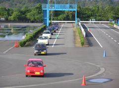 本来、この訓練はABS付のクルマじゃないとかなり難しいらしいです。というわけで、がんばってください。とのこと。おそるおそるみなさんトライしたのでした。2枚目の写真がスピン後の状態。青いパイロンの間にスキッド発生装置があり、リヤタイヤを蹴飛ばすような仕組みです。最初は30km/hで進入。その後、35,40km/hとトライしましたが、40km/hまで行くとリカバリーできても、なかなか止まれずウォーターバリアにつっこむのは避けられませんでした。リカバリーできたトゥデイは結構少なかったかも。やはりABSがないと難しいです。でも日常では体験できない感覚にみなさん楽しめたのではないでしょうか。下にリカバリーに成功例と失敗例を公開します。誰かはクルマで判断してください。