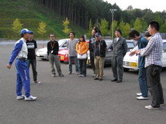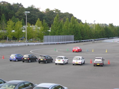 15:00よりアクティブセーフティパークへ移動し、第1回目のスキッドリカバリー体験を実施しました。参加したのは全8台。これは滑りやすい路面の入口で強制的にスピンを起こさせ、いかにリカバリーできるかを訓練するショートプログラムです。トレーナーから最初の説明があり、参加者に対して「ABSがついてないクルマの方いらっしゃいますか?」という質問があり、すかさず全員の手が挙がりました。トレーナー「・・・。」ん?どうしたのでしょうか。それほど予想外だったのでしょうか。