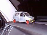 このワゴンRプラモデルもヘッドライト+フォグランプ、左右ウインカー、ブレーキランプ(Withハイマウントストップランプ)が実車の操作に連動して点灯します。写真はワゴンRのダッシュパネル上です。