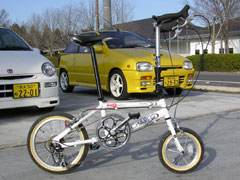 全然モディファイとは関係ありませんが、折りたたみ式自転車”チャリQ”を入手したのでレポートします。以前も半分に折れるタイプの24インチ折りたたみチャリを持っていましたが軽自動車に載せるにはちょっときつい。そこでチョロQタイプのデザインも気に入ったのでこのチャリQを購入しました。