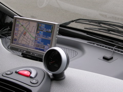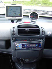 スマートのダッシュボードはS字型に曲がっています。運転席と助手席が前後にオフセットしているのとデザインをうまく調和させています。これが都合よく、ナビの場所をつくってくれました。助手席側の奥行きが広いのでここにナビを設置。視認性もなかなか良いです。