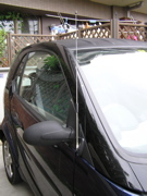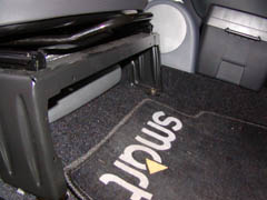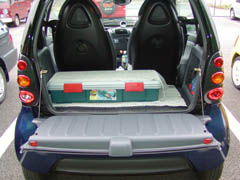 当初リーザとトゥデイに載ればいいかなと思ってましたが、なんとスマートにも搭載できましたので報告します。ハンドルの根本から折れるようにたたむ構造です。運転席側の後にちょうど、小径フロントタイヤがすっぽりはいるので、この角度以外では搭載できません。リーザ、トゥデイなら重ねれば2台入るかも。【2007.02.25】