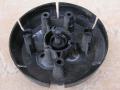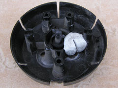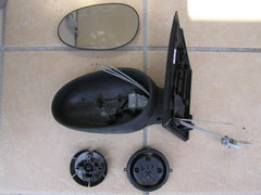 分解していくと、3本のワイヤーで上下左右をコントロールしていることがわかりました。そのうちの1本がなぜか短い。スペーサーをいれてやれば解決しそうだったんですが、なんで短くなるんだ?と疑問が。さらに調べていくと、ミラー側の付け根の樹脂部品が壊れていることがわかりました(写真3枚目)。ワイヤーガイドを固定する部分が割れて、突き抜けてしまってたのです。そこでエポキシパテで元の形状を復活させて動作するようになりました(写真4枚目)。【2007.08.25】