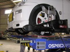 装着が完了したら、センサーの校正を行います。リフトには前後にそれぞれ油圧ジャッキが内蔵されています。これを使ってサスペンションアームから車体を持ち上げます。その状態で、車輪を回転させて3つの角度でのセンサーの位置を測定して校正が完了します。
