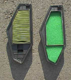 以前、M'sパワークリーナーを手に入れ、トゥデイにつけようと企んでいましたが、エンジンルームに入るスペースがなく断念しました。そこでライフ用純正交換式エアクリーナーを手に入れようと思ったら、MTRECエンジンとは形状が異なることが判明。結局、純正エアクリーナーを加工してパワーフロー化しました。純正では吸入口が限られているので一部を切り抜き吸入口を拡大し、レスポンス向上をねらいました。(写真左)【1999.4.30】
