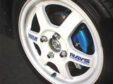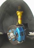 今度は話題のクルマ”インサイト”から流用。トゥデイ純正品と比べると12から13インチディスク大型化、アルミキャリパー、大型パッドにより制動力アップ、ばね下重量の軽量化と2度おいしいチューン。キャリパーとディスクはアルマイト処理っぽく耐熱シルバーの上にクリアブルーでペイント。ディスク大型化のおかげで吸い付くような制動力には感動です。【2000.4.1】