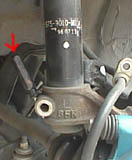 ショック交換のアドバイスとしてひとつ。赤い矢印を見て下さい。トゥデイ、ライフのショックはナックル側がボルト一本で抱えられています。これを抜くのが一苦労。そこで太いマイナスドライバーを写真の様にたたき込みます。こうしてクリアランスを広げておけば抜くのも楽になります。ただし、スタビが付いてるので外すときは左右同時にやると簡単です。リヤに関してはアッパーマウントを外す必要なし。ショックの頭を緩めるだけで交換可能です。スプリングコンプレッサーも必要なし。(フロントはいるけど)
