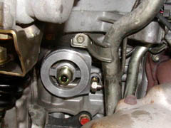 水温計は直径26mmの大森製アダプターをホース中間に設置し問題なく完了。続いてジャッキアップし、オイルを抜いてオイルブロックの位置を確認。するとエンジンのリブが3方向に立っているためブロックから外にはみ出るセンサー部分と干渉してつきません。リブの立ってない方向には純正のオイルプレッシャースイッチがあってやっぱりだめ。なるほど四面楚歌。これであきらめられないのが私の性格。消去法でいくとオイルプレッシャースイッチを外してしまえばなんとかなりそう。というわけでオイルプレッシャースイッチを外してめくら蓋(写真の金色の部分)をつけて写真のようになんとかオイルブロックの装着が完了。配管の長さもぎりぎりでした。油圧が確認できればオイルプレッシャースイッチなど必要ありませんからね。(まだ排気温度計が残ってますが、これはまた今度)【2002.3.9】