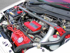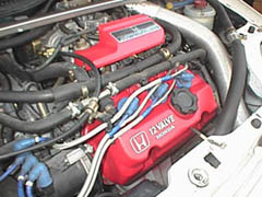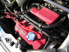 花粉症の季節も終わり、今年もクルマいじりシーズンに突入。急遽ツインリンクもてぎにてミニMTTをやることになったので細かいイメージチェンジを実行。赤ヘッドは塗装がはげていたので再塗装。2001.11.18 と同様の手法で化粧塗装。ついでにタワーバーとブレーキキャリパーも同色(ミラノレッド使用)に。フィラーキャップはタイプRっぽくメッキ調スプレーで塗装。アーシングはおまけで3本ひいてみました。【2003.05.01】