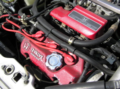 やはりトゥデイ・タイプRなエンジンルームとするには赤いヘッドじゃないと。といってもただ赤く塗ったのではタイプRじゃない。あのザラザラした表面を実現すべくいろいろ検討した結果、ごらんのように化粧塗装で完璧!(あ、写真じゃわからなかったりして・・・)