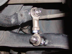 やはりライフ用のロアアームに交換か?(高いし、めんどくさい)とくじけそうになりましたが、ロアアームに10mmの穴(サス取付部より140mm)をあけてステンボルト(上部40mm、下部45mm)を使ってロッドを固定。リンク長を短くする必要があったので薄ナットとおねじ部を5mmほどカットして装着しました。走ってみると初期の微妙なロールがおさまりシャキッとなりました。【2003.11.24】