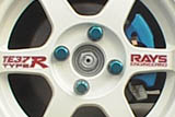 オールペン前に盗難にあったTE37。下地処理のために外して玄関先に3日間置いて有休を取ってさあはじめるか・・・ない!。結局出てくるわけもなくあわてて再度入手しました。オールペンまでに間に合ったのでホイールもチャンピオンシップホワイトです。今度はアルミロックナットに加えて、青いロゴをはがしたので赤色でロゴを作り直しました。名付けて"TE37 typeR"です。あとはHマークのセンターキャップをつける予定。【2000.5.27】